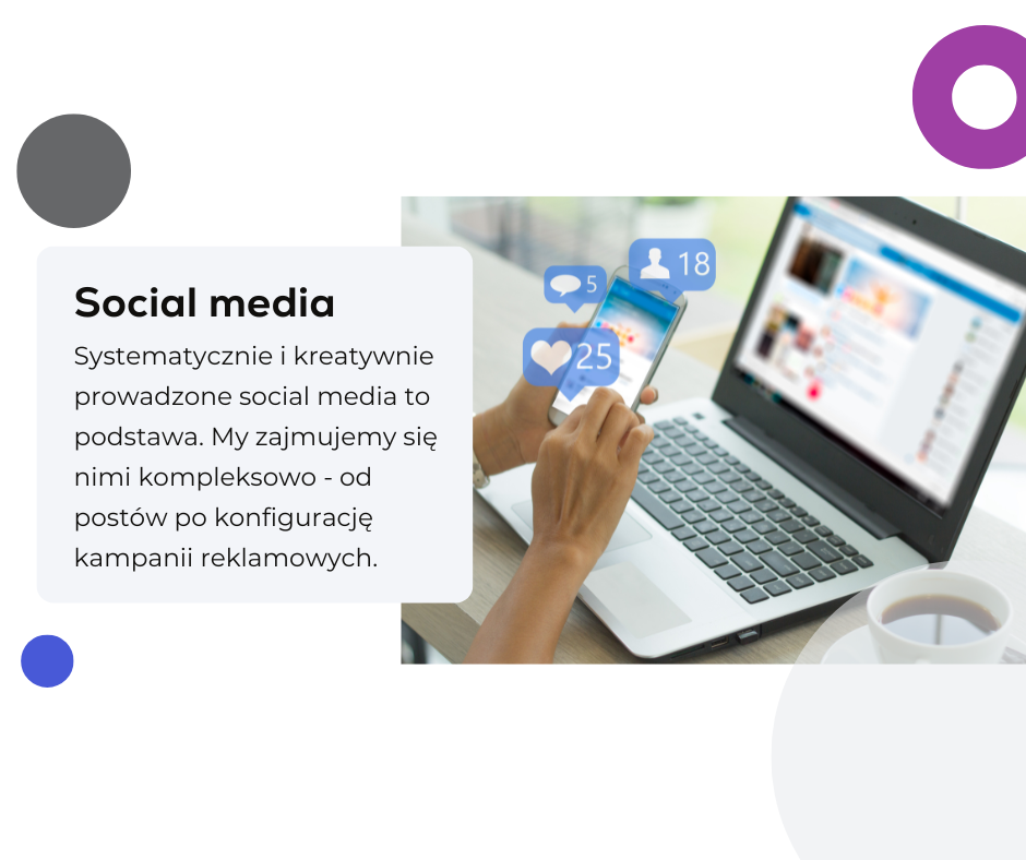 Nasza agencja marketingowa to zespół ekspertów, którzy pomagają firmom wyróżnić się w sieci. Oferujemy kompleksowe usługi marketingowe, obejmujące tworzenie nowoczesnych stron internetowych, zarządzanie mediami społecznościowymi oraz skuteczne kampanie reklamowe. Wiemy, jak zwiększyć widoczność Twojej marki w social media, angażować odbiorców i generować sprzedaż. Działamy kreatywnie, analizujemy dane i dostosowujemy strategie do Twoich celów biznesowych. Zarządzamy mediami społecznościowymi, prowadząc angażujące kampanie reklamowe na Facebooku, Instagramie, LinkedIn i innych platformach. Tworzymy wartościowe treści, budujemy społeczność wokół Twojej marki i pomagamy w pozyskiwaniu nowych klientów.